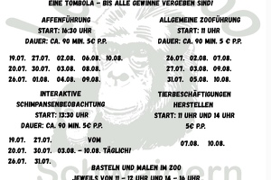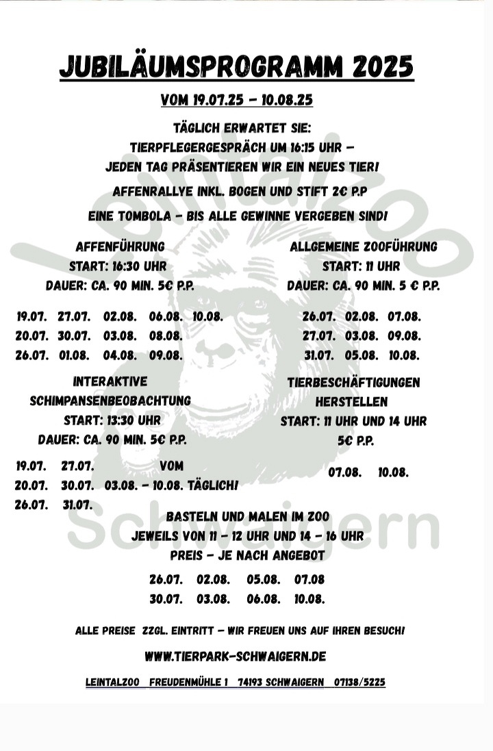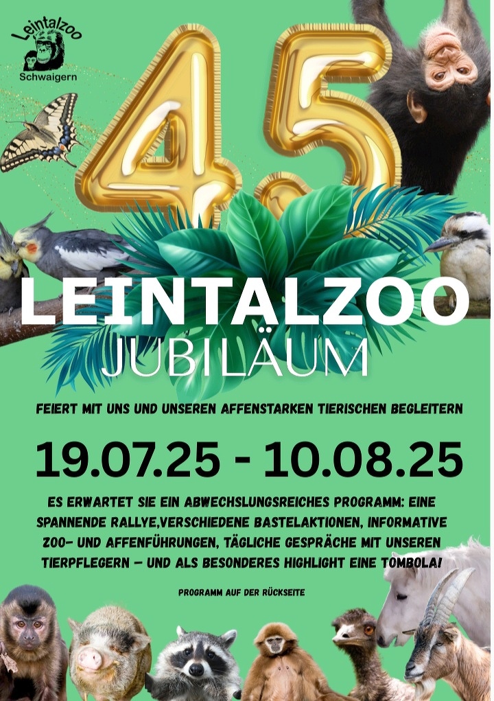 - Affenrallye Für nur 2€ bekommen Sie unseren Affenrallyebogen und einen Leintalzoostift und können auf eigene Faust unsere Affenarten genauer kennenlernen. Es gibt Bögen für verschiedene Altersklassen, damit es auch spannend bleibt. Auf dem Heimweg gerne eine kleine Mitmachbelohnung an der Kasse abholen !